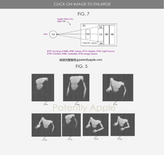 苹果专利图 7 示出了示例性头戴式设备(HMD);图 5 示出了用于表示电子设备用户的 3D 外观数据的逐步实时累积示意图。